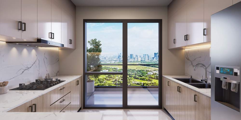 - Kitchen: Modular kitchen with chimney + hob, SS sink, geyser, branded CP fittings, quartz/granite/artificial stone countertop